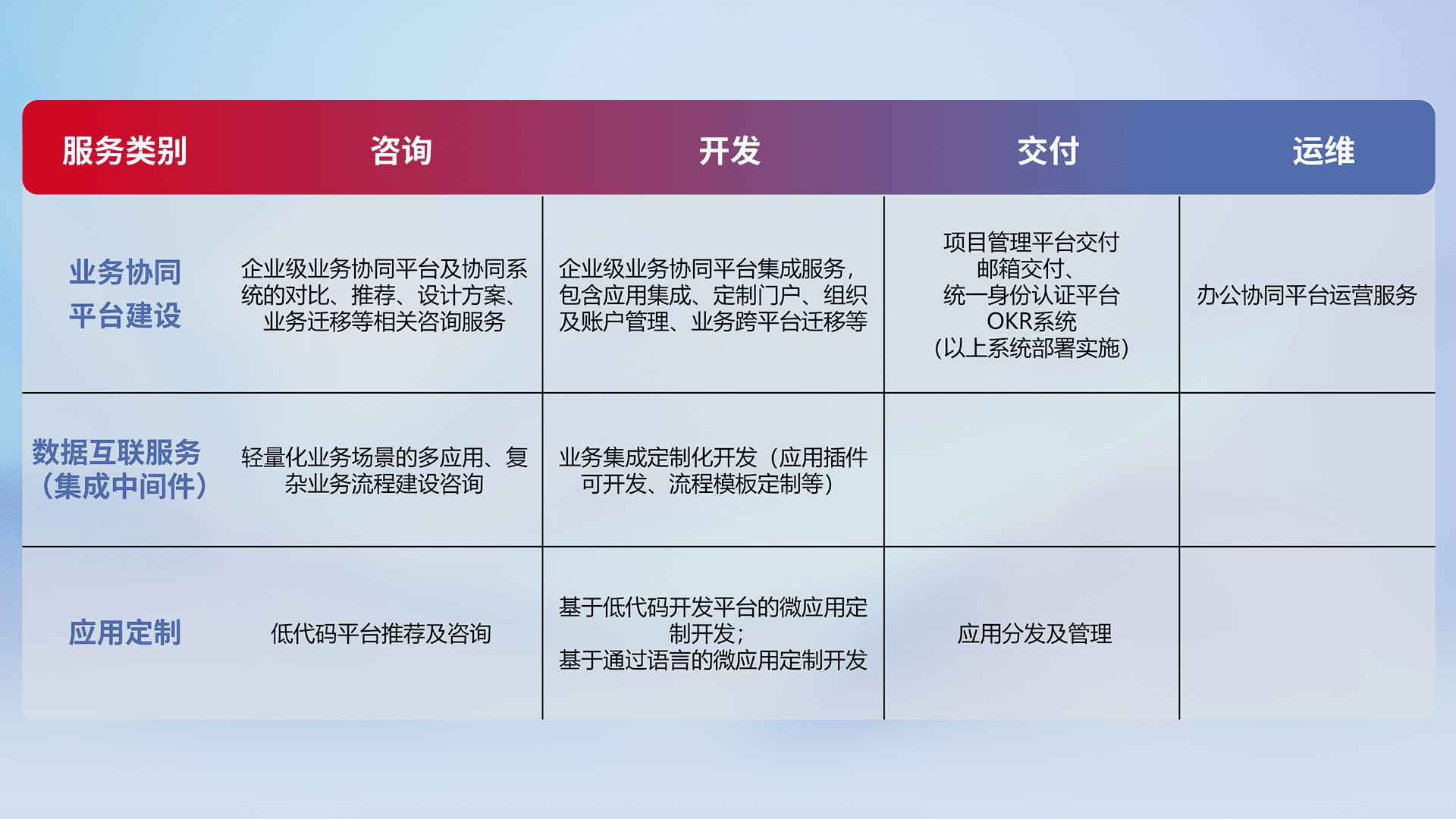 针对钉钉、、、企微、、、、IDaas等平台级产品提供产品的规划、、方案、、交付、、定制化开发等服务,,,,实现如统一协同办公、、、、智能客户服务、、混合会议管理、、智能数据查询、、、等业务场景,,,实现数字化转型。。